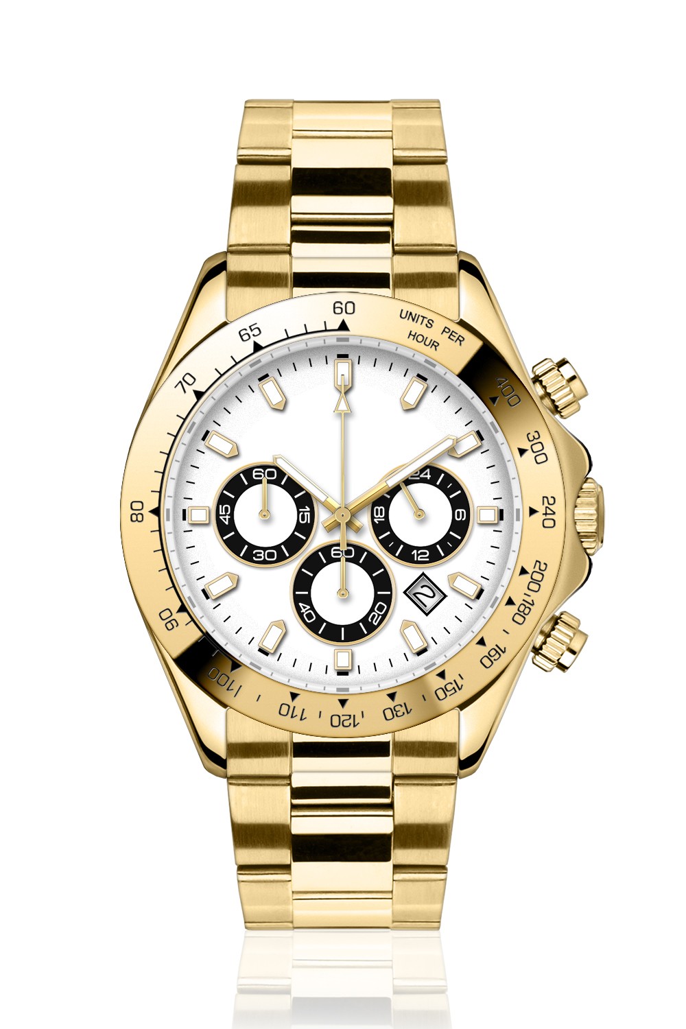 Stainless steel Case, tachymeter engraved on bezel - Finishing shiny, IP Gold - Diameter ø 39 mm - Case height 13 mm - Mineral Glass - Dial opening ø 30 mm - shiny dial with applied indexes in relief - Stainless steel screw Crown - Screw steel Caseback - Miyota OS20 / OS21 chronograph movement - Functions : hours, minutes, seconds, 24h, date, chronograph - shiny/brushed Solid stainless steel Bracelet, 20/18 mm - Brushed steel Buckle - Water Resistant 5 ATM