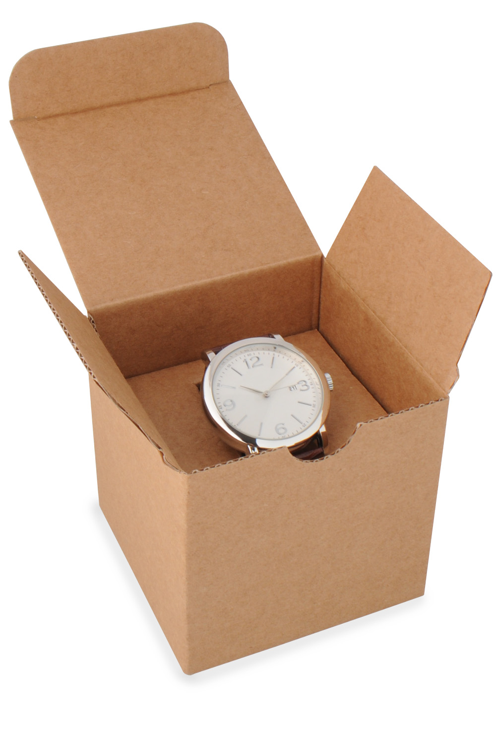Scatola in cartoncino rigido microonda colore avana completamente MADE IN ITALY ed eco-friendly. Il supporto portaorologio è anch'esso in cartoncino microonda. La confezione è riciclabile. Dimensioni: 9 x 9 x 9 cm. SPEDITO DA ASSEMBLARE.