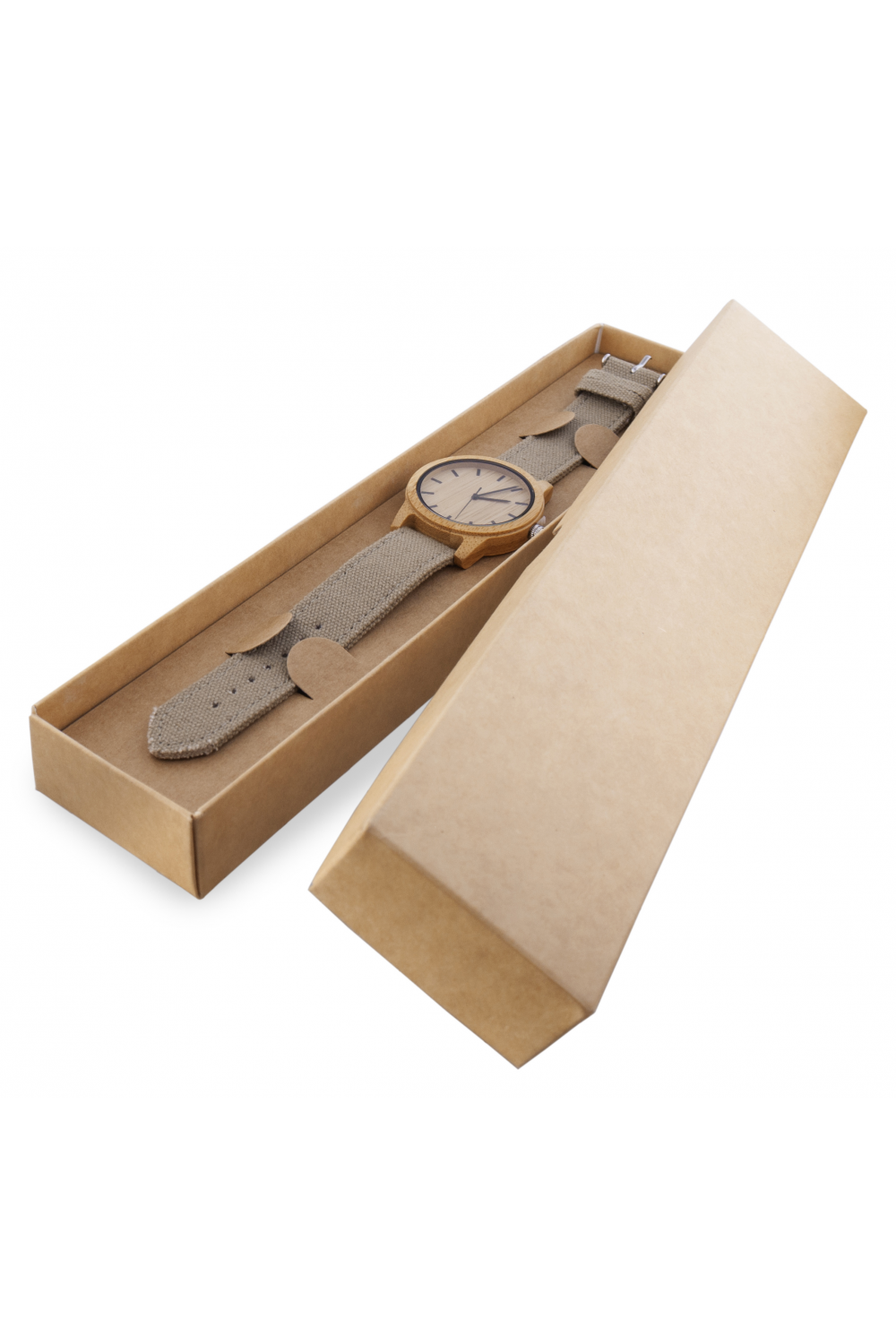 Scatola in cartoncino pregiato color avana MADE IN ITALY, con supporto interno per orologio. L'orologio viene conservato con il cinturino disteso. Dimensioni 6 x 3 x 2,8 cm