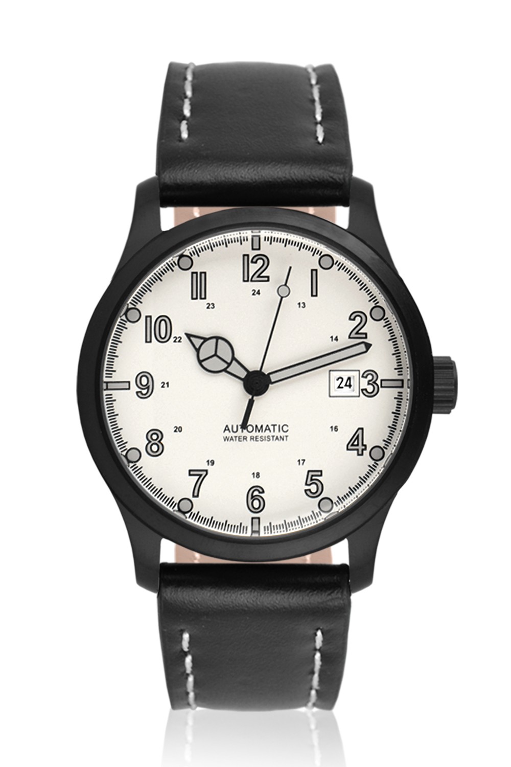 Cassa acciaio - Finitura PVD nera satinata - Diametro ø 42 mm - Altezza cassa 14,5 mm - Vetro minerale - Apertura quadrante ø 35 mm - Quadrante Indici/numeri con inserto luminoso - Corona acciaio serrata a vite - Fondello acciaio serrato a vite con oblò in vetro minerale e movimento a vista - Movimento 8215 Miyota Automatico - Funzioni ore, minuti, secondi, data - Cinturino vera pelle, 22/18 mm - Fibbia acciaio PVD nera - Water Resistant 5 ATM
