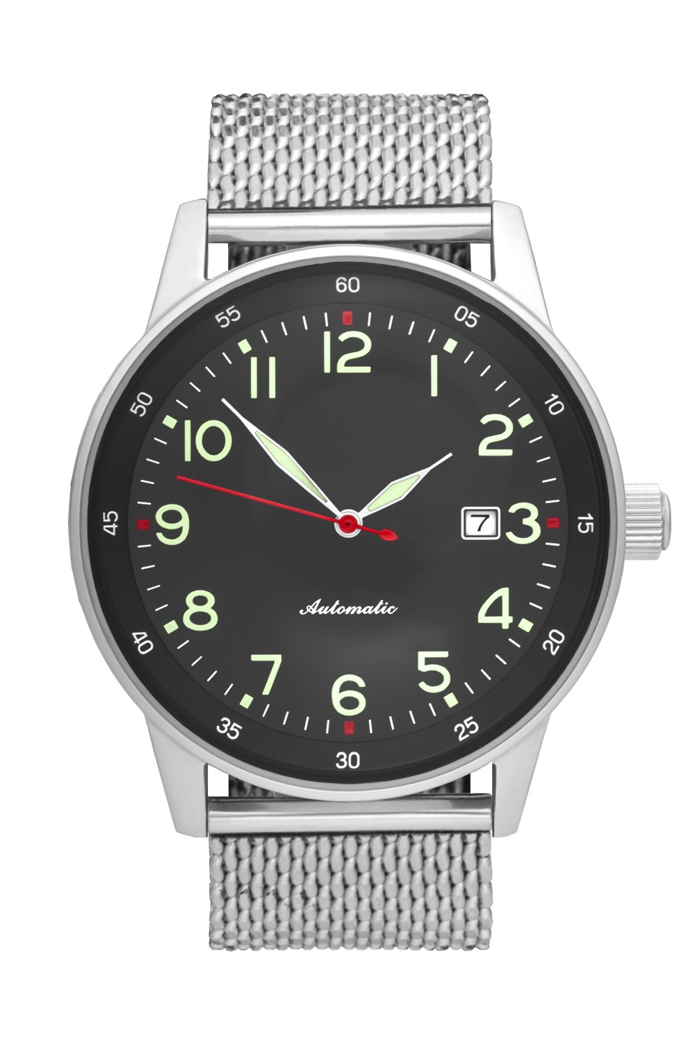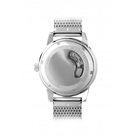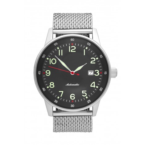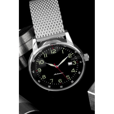Orologio meccanico automatico dal design minimale con bracciale in maglia acciaio. Quadrante con numeri e indici stampati luminescenti.