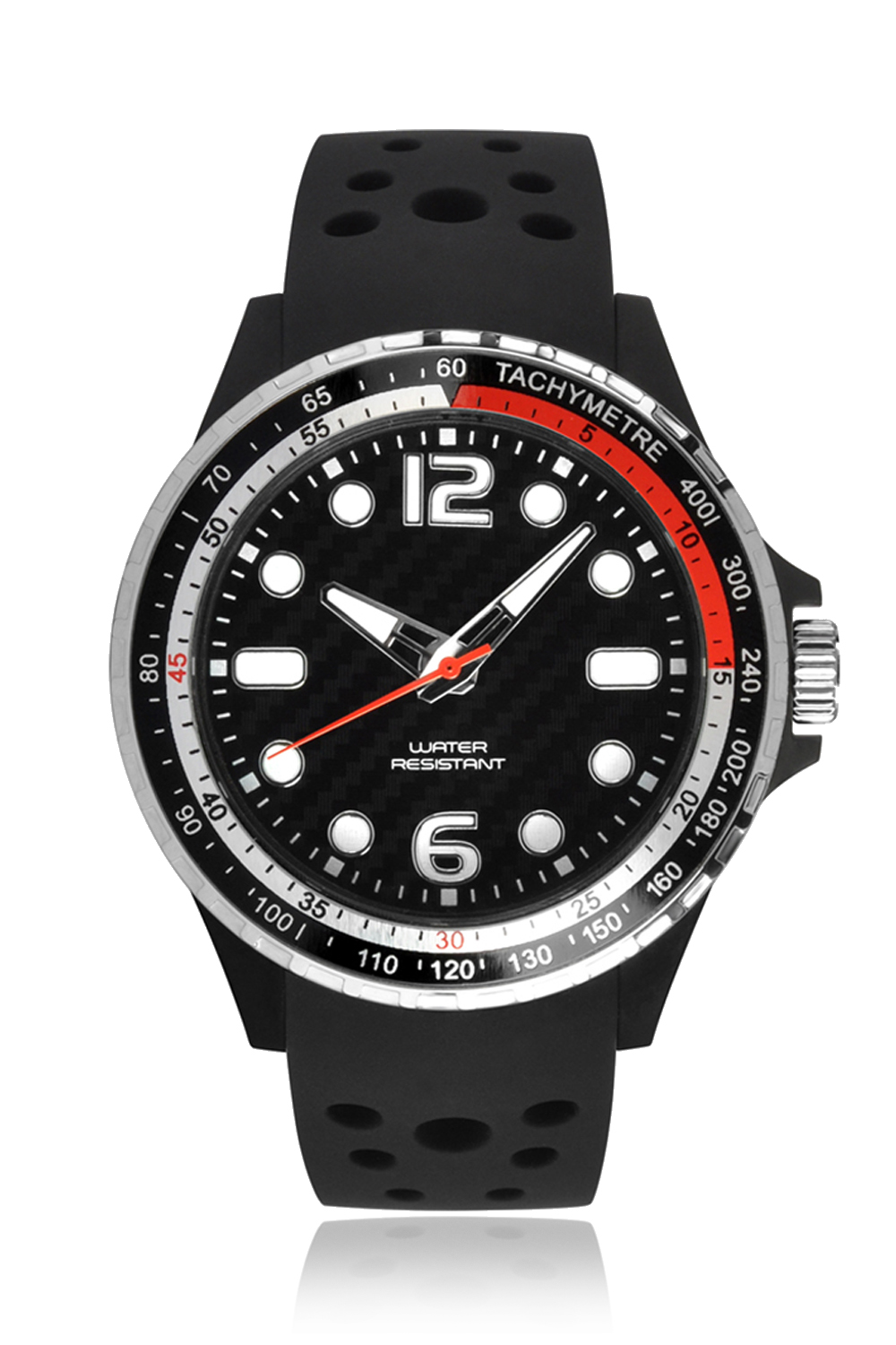 Cassa plastica, con top ring in metallo - Finitura opaca - Diametro ø 44 mm - Altezza cassa 13 mm - Vetro minerale - Apertura quadrante ø 33 mm - Quadrante carbon, numeri e index in rilievo con stampa luminescente - Corona acciaio chiusa a pressione - Fondello acciaio chiuso a pressione - Movimento 7T35 Miyota - Funzioni ore, minuti, secondi - Cinturino in silicone forato, 21/18 mm - Fibbia acciaio - Water Resistant - Peso 55 gr.