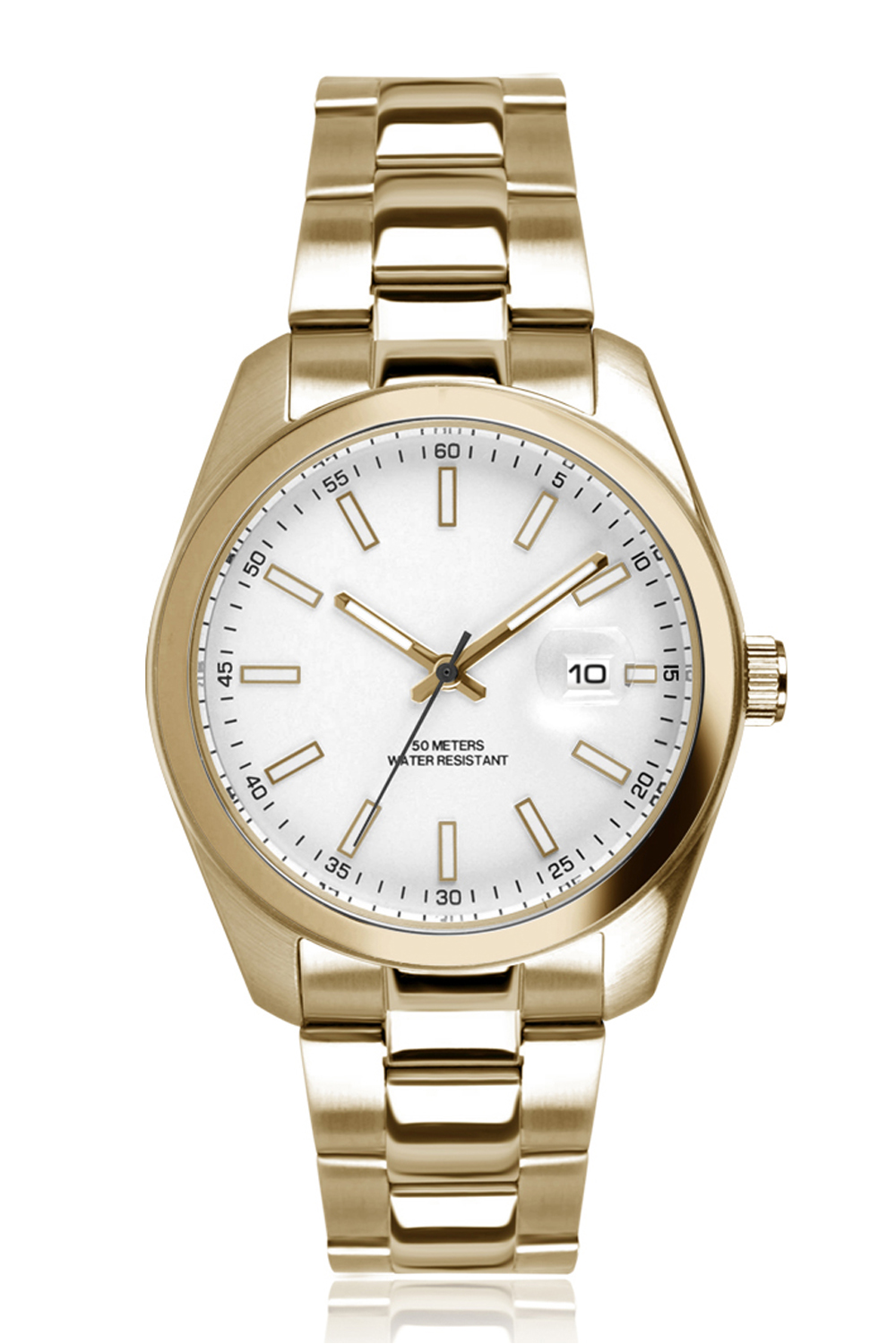 Cassa acciaio - Finitura lucida/satinata GOLD - Diametro ø 39 mm - Altezza cassa 10 mm - Vetro minerale con lente a ore 3 - Apertura quadrante ø 32 mm - Quadrante satinato, index applicati con stampa - Corona acciaio chiusa a pressione - Fondello acciaio serrato a vite - Movimento 2115 Miyota - Funzioni ore, minuti, secondi, data - Bracciale acciaio lucido / satinato, 20/18 mm - Fibbia deployante acciaio - Water Resistant 5 ATM - Peso 107 gr.