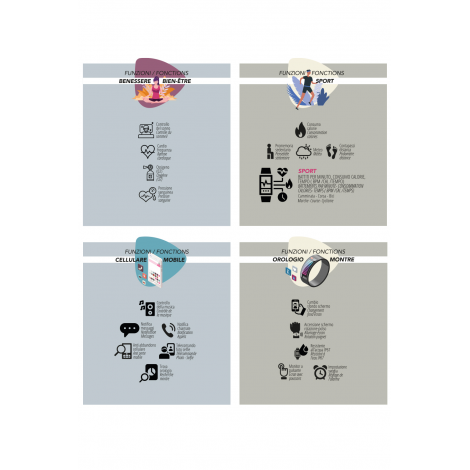 Cassa acciaio- Finitura lucida - Display LCD ad alta luminosità - Fondello plastica con sensori - Caratteristiche connessione bluetooth, ricaricabile tramite USB - Batteria polimeri di litio, durata in stanby 7 giorni - Bracciale acciaio - Water Resistant - Requisiti minimi Android 5.0 / Apple IOS / IOS 9.0 - Funzioni: cambio sfondo schermo, accensione schermo tramite rotazione del polso, sveglia, monitor a pulsante e Resistente all'acqua - Funzioni benessere: livello di saturazione di ossigeno nel sangue (02), Pressione sanguigna, Controllo della qualità del sonno, frequenza cardiaca - Funzioni sport: pedometro, distanza percorsa, consumo calorie, promemoria sedentario, meteo, battiti per minuto e tempo (BPM/CAL/TEMPO), Sport: Camminata, Corsa, Bici - Funzioni cellulare: notifica chiamate e messaggi, trova orologio, controllo della musica, controllo remoto foto, funzione anti-smarrimento smartphone